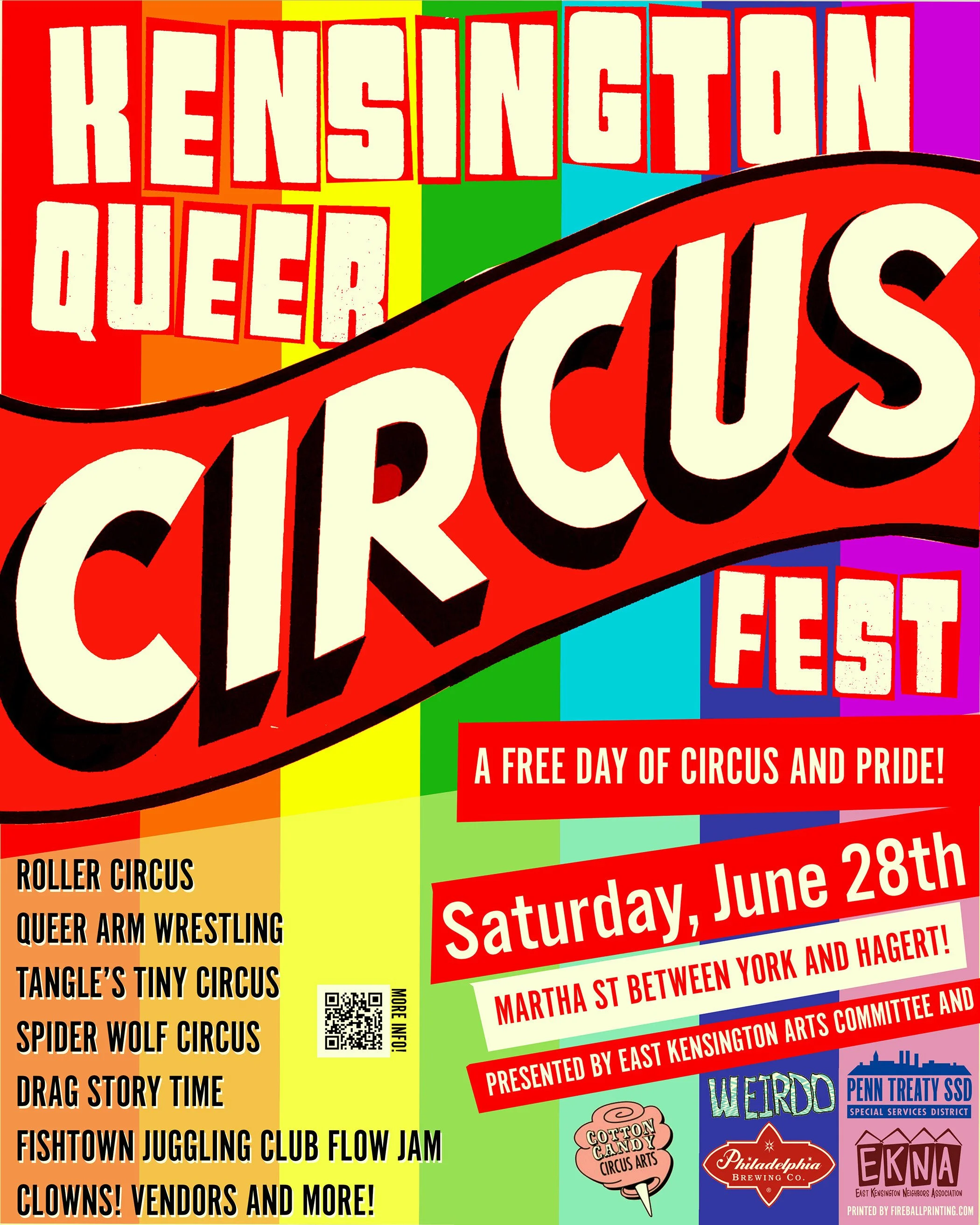Happy Pride Month! Join us for a free day of circus and pride at Philadelphia Brewing Company and Martha Street on June 28th. We’ll have Roller Circus, Queer Arm Wrestling, Tangle’s Tiny Circus, Spider Wolf Circus, Drag Story Time, Fishtown Juggling Club Flow Jam, clowns, vendors, and MORE! We’ll be taking over Martha Street between York and Hagert. Party starts at 3pm. See you there!