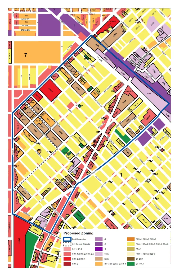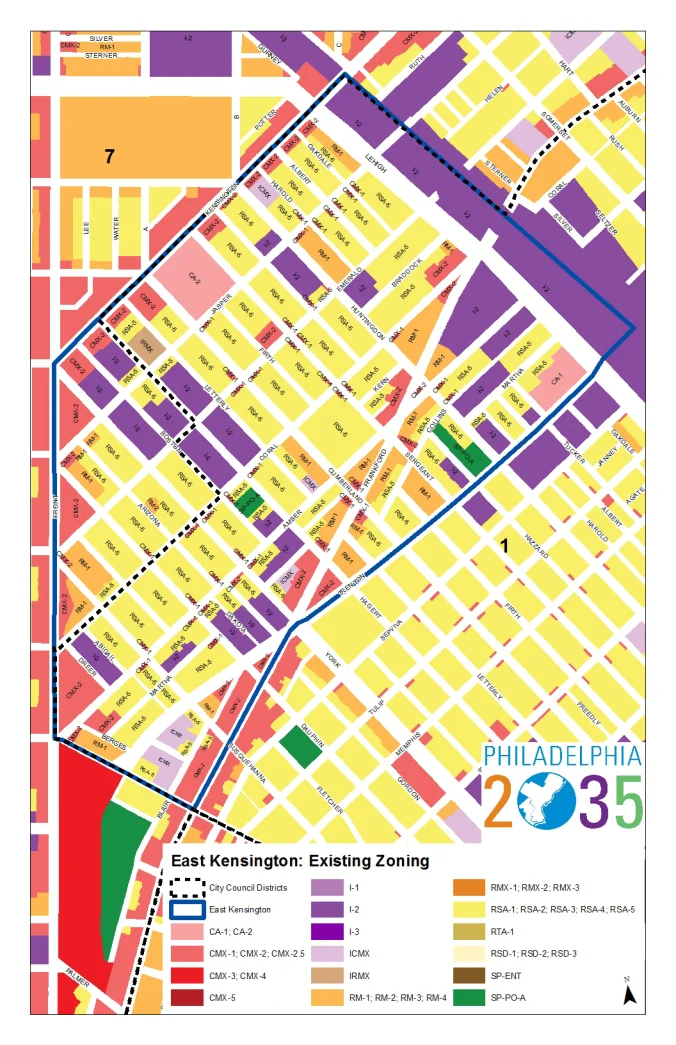 In 2016, the zoning of East Kensington was remapped by the Philadelphia City Planning Commission. This was part of a community process, and reflects the recommendations of the East Kensington Transportation and Community Development Plan and the Frankford Ave Arts Corridor Plan.